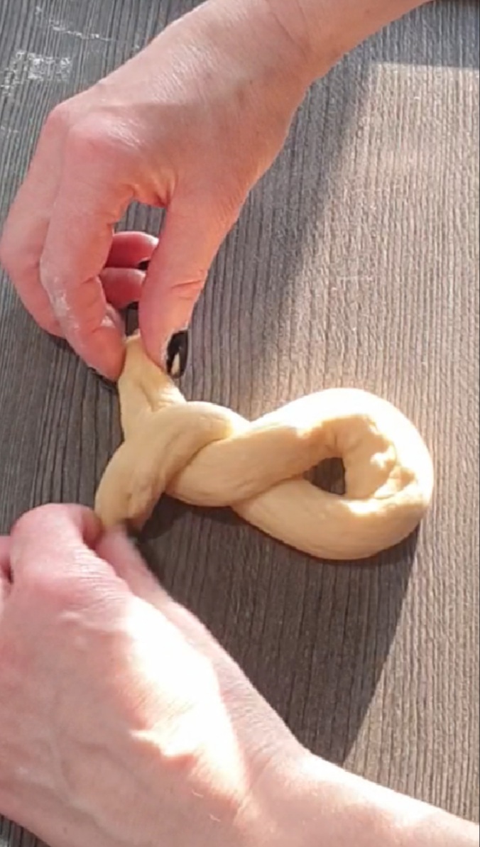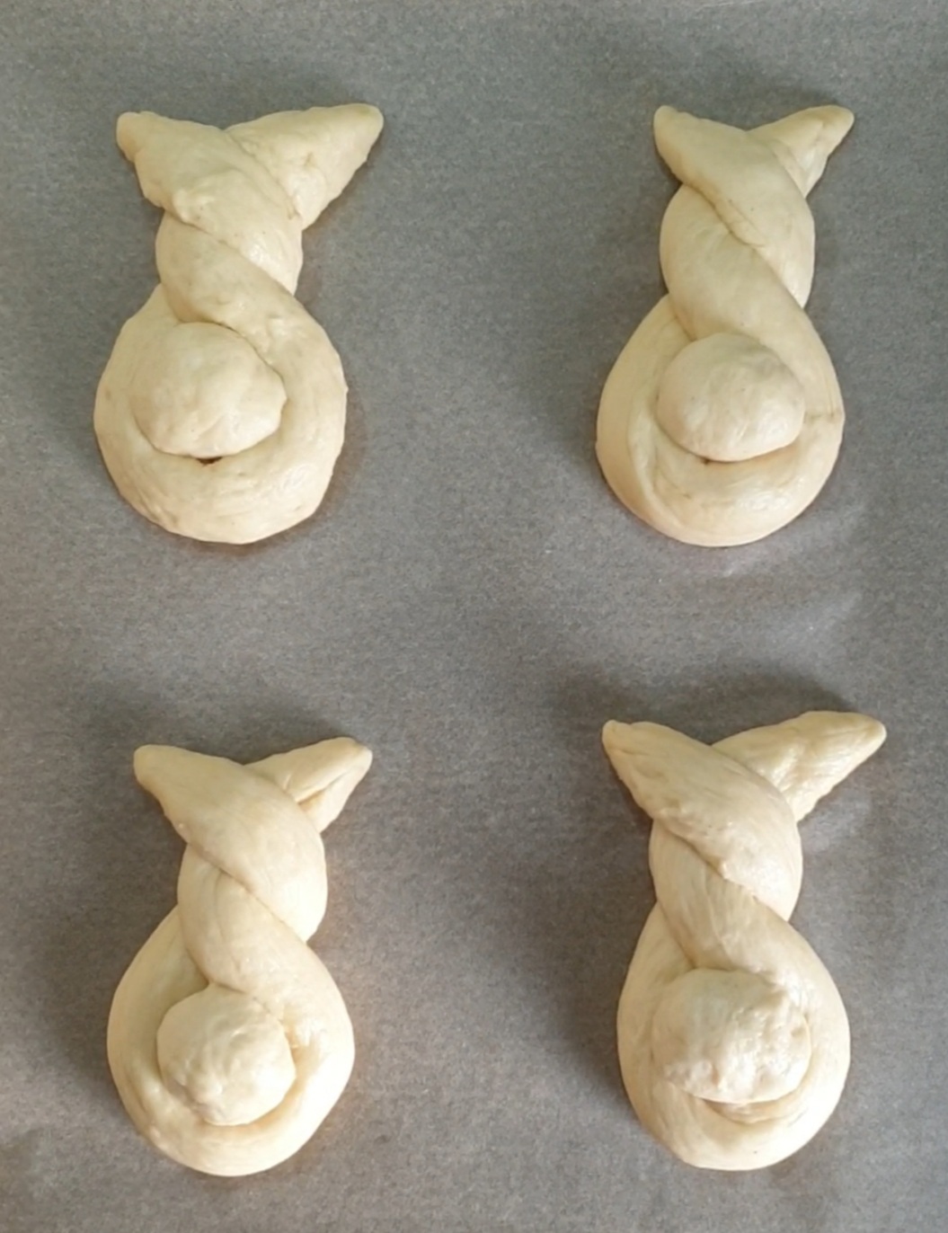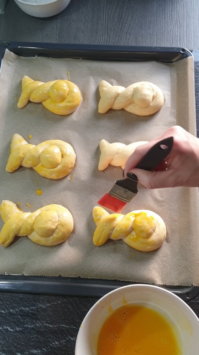 Jeden Strang zu einem U legen und die Enden zweimal locker umeinander wickeln. Unten sollte eine Öffnung bleiben. Jetzt ein Stückchen vom beiseite gelegtem Teig nehmen, eine Kugel formen und die Öffnung so damit verschließen, das ein kleines Schwänzchen hervor steht. Vorsichtig auf das Backblech legen. Mit jedem Strang genauso verfahren. Darauf achten, das zwischen den Häschen genug Platz ist.