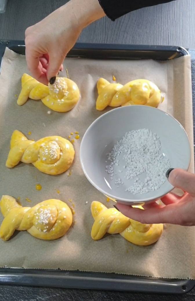 Das Eigelb mit der Milch verquirlen und die Häschen damit bestreichen. Die Schwänzchen mit dem Hagelzucker bestreuen. Auf mittlerer Schiene in ca.15 Minuten fertigbacken.