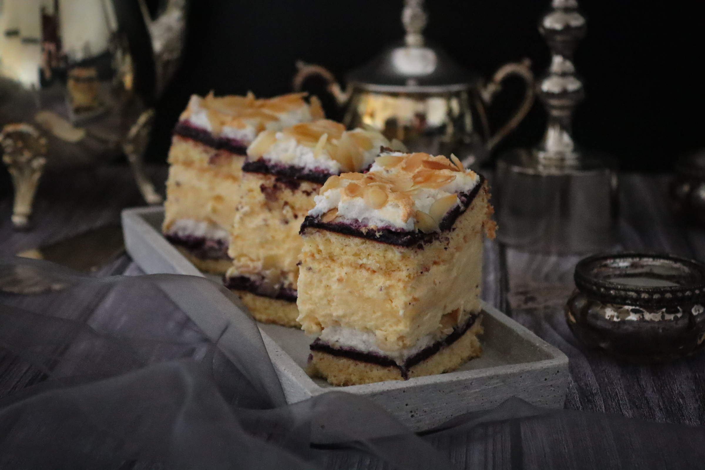 Diese Heidelbeer-Mandelschnitte ist perfekt, um sich den Nachmittag zu versüßen. Wenn es mal keine Torte sein soll, kann man seine Gäste wunderbar mit diesem Kuchen verwöhnen. Ich habe mich für Heidelbeeren entschieden, weil ich sie wirklich sehr gerne mag und sie toll zu der Mandelcreme passen. Natürlich funktioniert auch jede andere Beere.