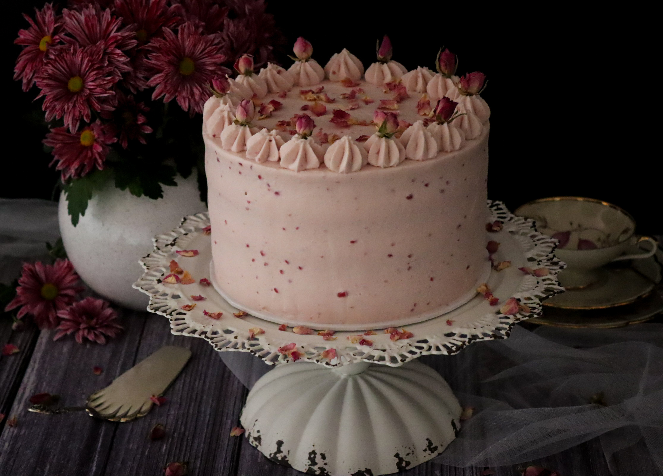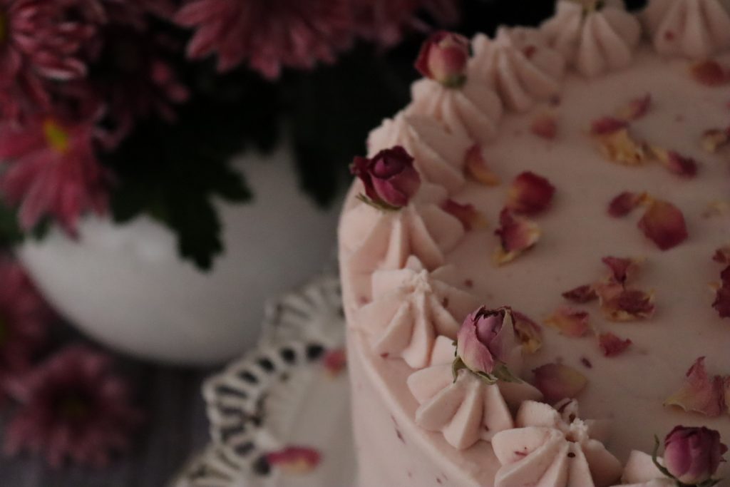Die Torte aus dem Ring lösen und mit der Kirsch-Quarkcreme Einstreichen. Mit der restlichen Creme kleine Tupfen aufspritzen und mit getrockneten Rosen und Rosenblättern verzieren.