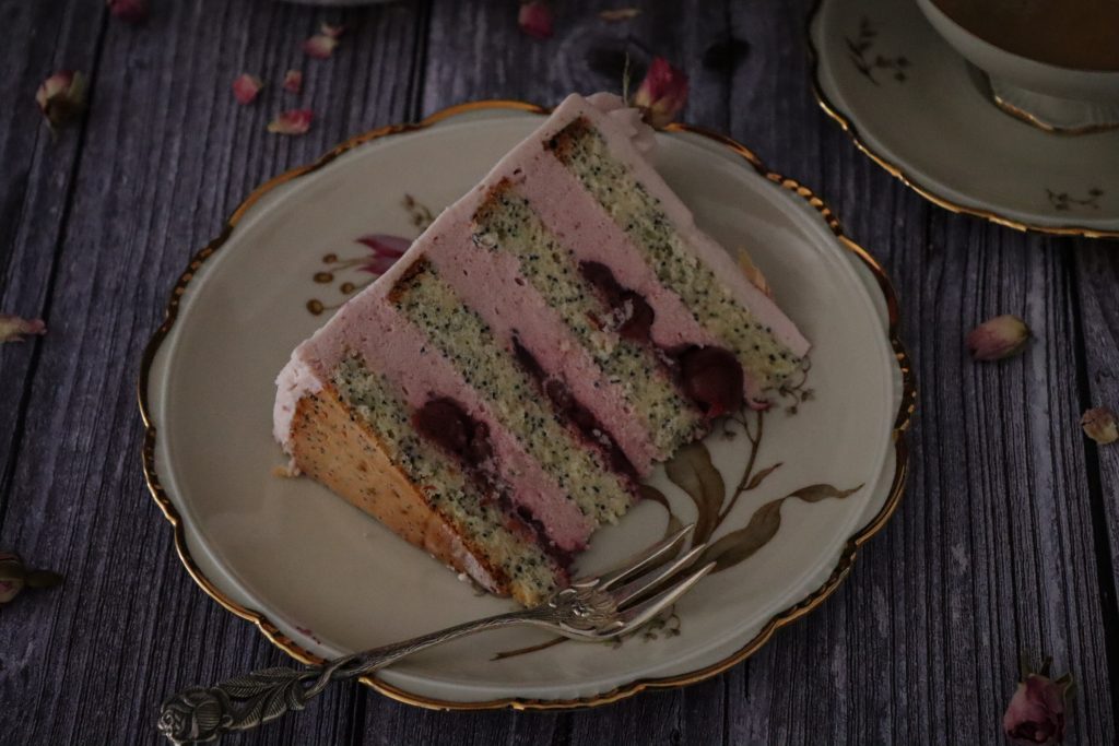 Diese Kirsch-Mohn-Marzipantorte ist die Wunsch-Geburtstagstorte meiner Tochter. Ich habe einen Wienerboden gemacht, der mit Mohn und Marzipan verfeinert wurde. Zwischen den Böden, die mit einem Hauch Amaretto getränkt sind, findet ihr eine köstliche Kirsch-Quarkcreme und Kirschkompott. Dekoriert habe ich mit getrockneten Rosen und Rosenblättern. Ich finde, die passen einfach wundervoll zu einer rosa Torte.