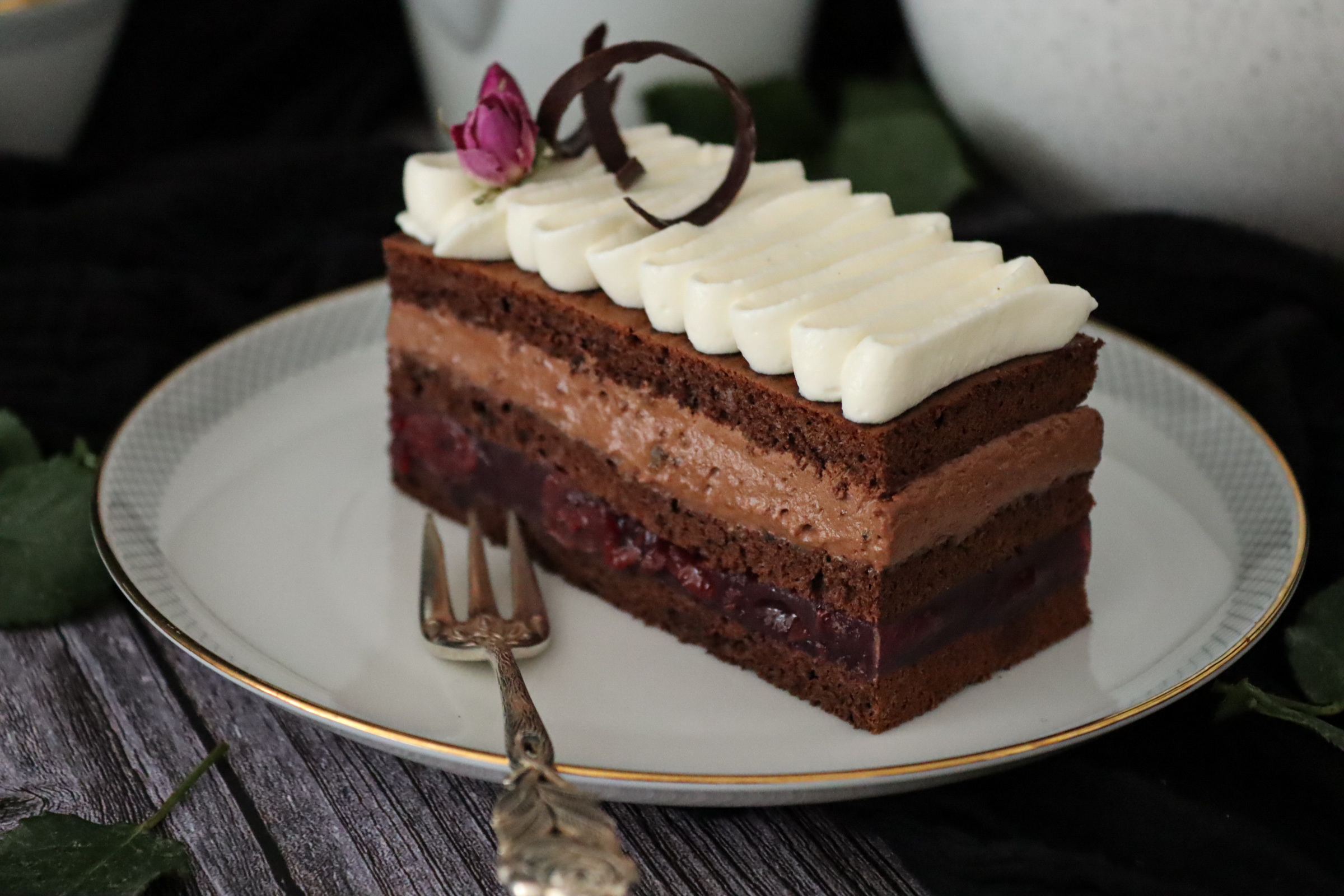 Ich bin ja kein Freund der klassischen Schwarzwälder Kirschtorte, deshalb habe ich sie neu interpretiert und zwar in Form dieser köstlich Schwarzwälder-Kirschschnitte. Ein leckerer Schoko-Tonka-Biskuit mit Schichten aus Kirschkompott, Schokomousse und einer Ricottacreme, die mit Rosenblütenwasser verfeinert ist. Natürlich darf das Kirschwasser nicht fehlen, womit ich die Böden getränkt und das Kompott verfeinert habe. Köstlich!